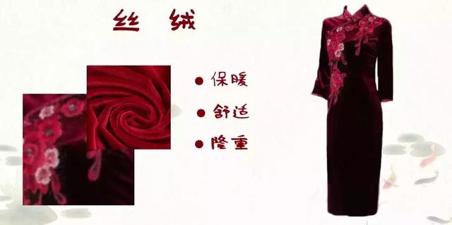 丝绒旗袍最适合秋冬穿着,温暖舒适,手感丝滑,有韧性,柔软、亲肤,丝绒与人体有着极好的相容性,光泽感较强。