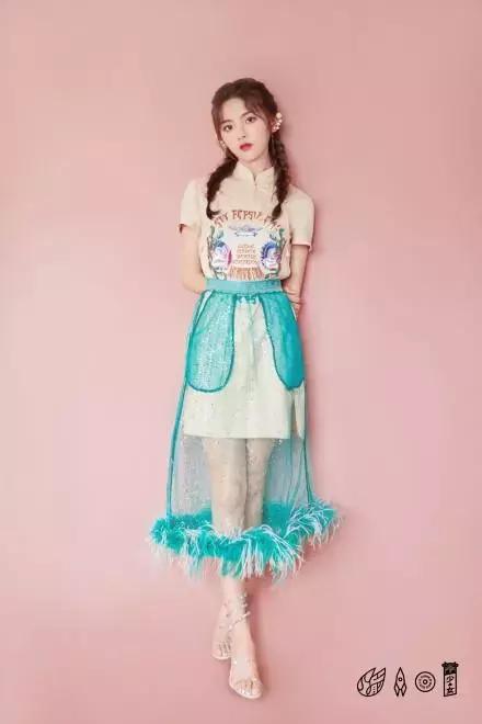 杨超越这身改良式旗袍裙,外搭绿色纱质罩裙,浅浅的绿色又略带blingbling,看起来唯美浪漫,裙子底部也是羽毛流苏的设计,看起来时髦又可爱▼。