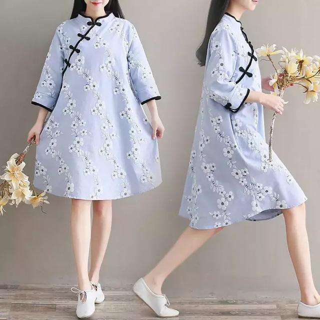 清新的蓝色底纹配上素色印花,黑色锁边满满的复古风。而娃娃衫版型的改良式旗袍能够轻松遮住各种小肚腩、大屁股,让你体会无压力也能穿旗袍!简直是肉肉女生福利啊!▼